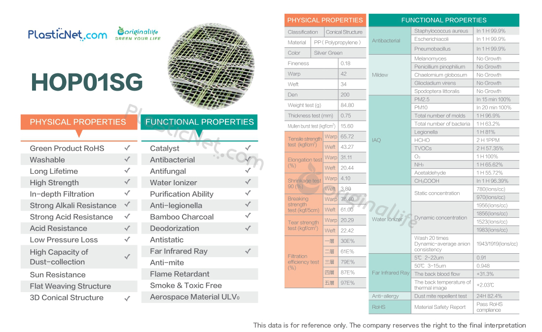 Antibacterial, anti-mold, anti-static, negative ions, deodorizing, anti-allergic, durable, non-toxic, far-infrared, low pressure drop, green product.
