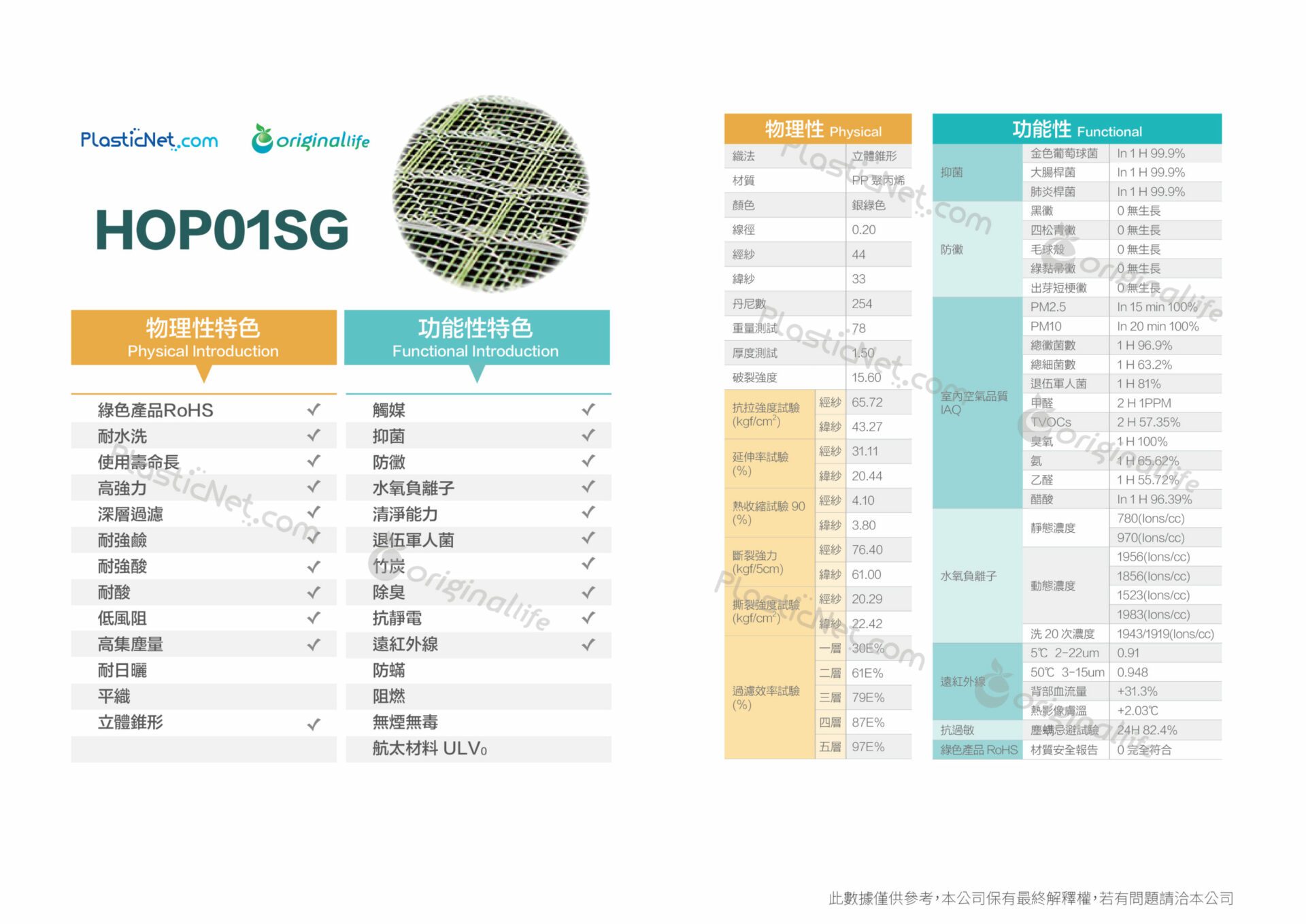 抗菌,防黴,抗靜電,負離子,除臭,抗過敏,耐用,無毒,遠紅外線,低壓損,綠色產品